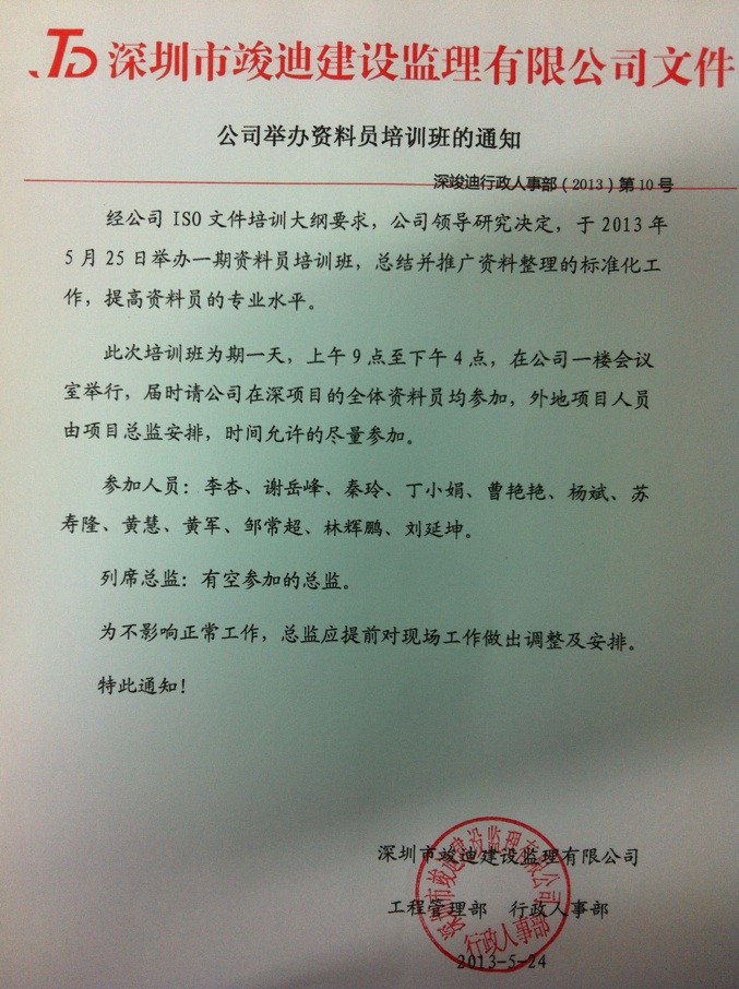 公司举办资料员培训班的通知
