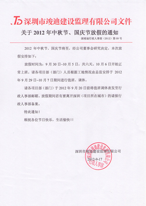 关于2012年中秋节、国庆节放假的通知